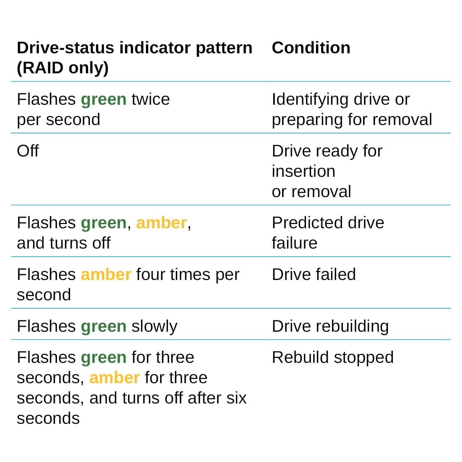 Each hard drive carrier has an activity indicator and a status indicator to provide information about the current status of the hard drive. The activity LED indicates whether or not the drive is currently in use,while the status LED indicates the condition of the hard drive.