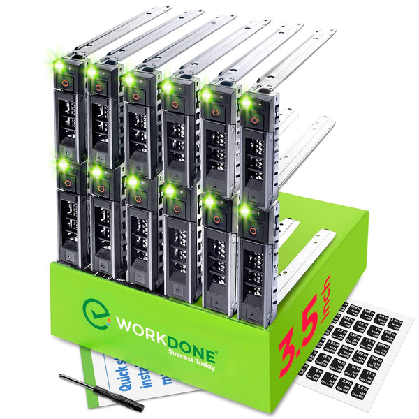 Deploy complete server storage with confidence. Fully compatible with original Dell part numbers WH5D2, 0Y796F, 0X7K8W. This 12-pack features exclusive WORKDONE Bright LED technology for unmatched drive status visibility in demanding data center environments. This Dell sled is a professional Dell SSD caddy with drive caddy and drive carrier compatibility, featuring drive sled and drive tray design with hard drive caddy functionality for enterprise deployments.