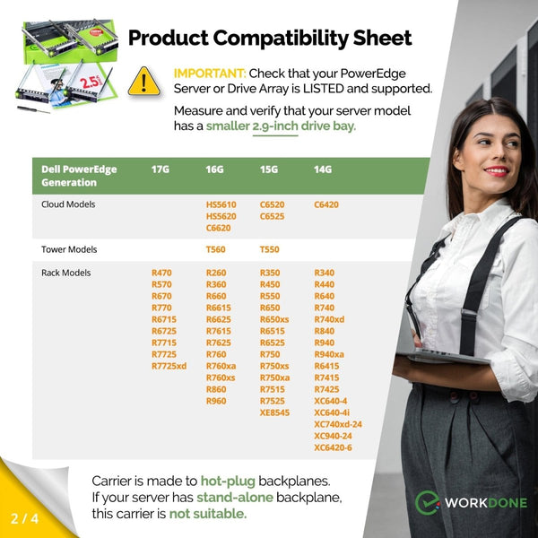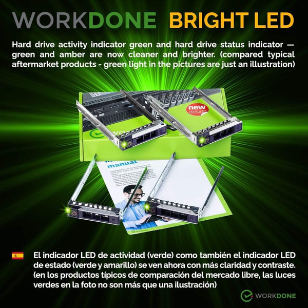The professional 4-pack for serious SSD deployments. Fully compatible with original Dell part number 0DXD9H. Features exclusive WORKDONE Bright LED technology for superior drive monitoring across your RAID configurations. This Dell hard drive caddy is a professional drive carrier with Dell HDD caddy and Dell SSD caddy compatibility, featuring Dell hot-swap capability for your Dell server caddy infrastructure.
