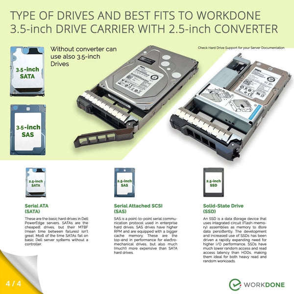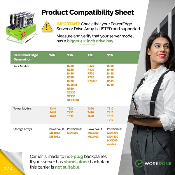 README FIRST: Check that your PowerEdge Server or Drive Array is LISTED and supported. Your Dell server has to have a 4.2-inch / 10.7 cm Hot-Plug Drive Bay. This 3.5-inch Drive caddy supports ONLY 3.5-inch hard drives and with converter 2.5-inch hard drives. Please, contact us if you are not sure.