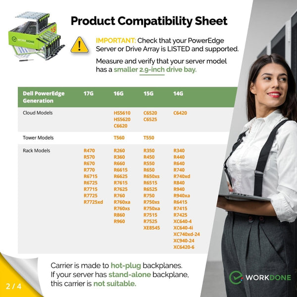 Deploy high-performance storage across your entire Dell PowerEdge infrastructure. Fully compatible with original Dell part number 0DXD9H. This 12-pack features exclusive WORKDONE Bright LED technology for unmatched drive status visibility in demanding data center environments. This 2.5 caddy is a professional Dell 2.5 caddy with Dell sled and drive sled design, featuring hard drive caddy tray compatibility for your server caddy and hot-swap infrastructure needs.