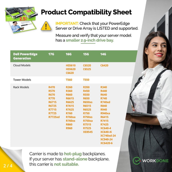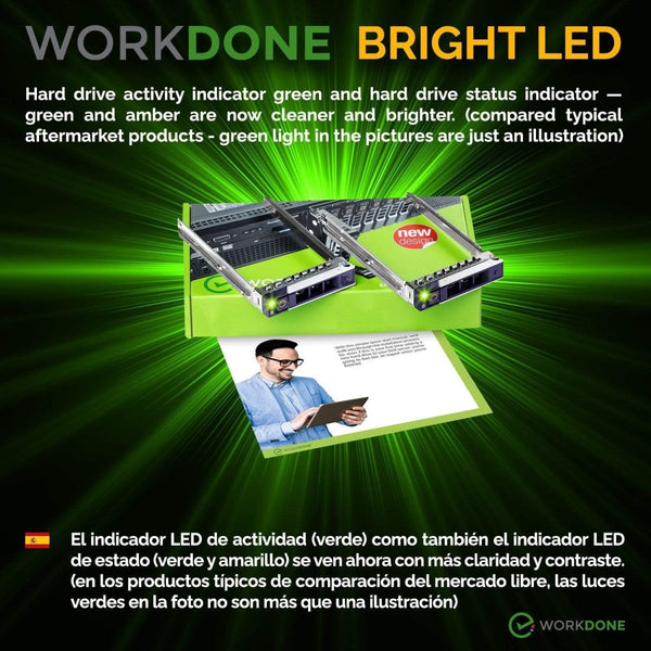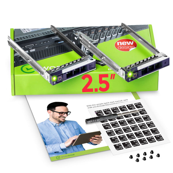 The perfect 2-pack for high-performance SSD deployments. Fully compatible with original Dell part number 0DXD9H. Features exclusive WORKDONE Bright LED technology for superior drive monitoring in modern server environments. This 2.5 drive caddy is a professional Dell caddy 2.5 solution with Dell drive carrier and drive sled design for your Dell disk tray needs.